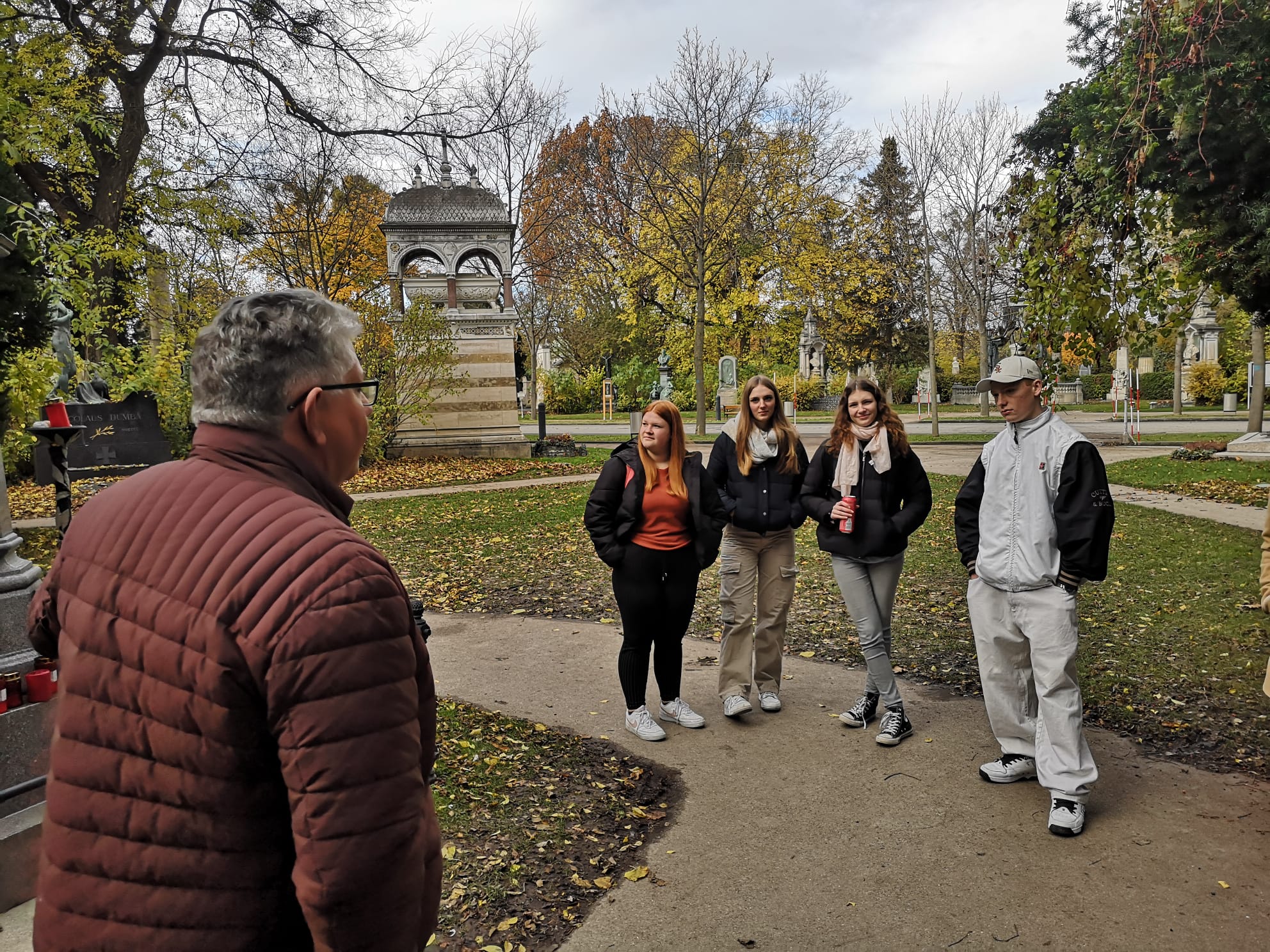 Ende November und Anfang Dezember besuchten die 7. Klassen, zum Teil bei herrlichem Friedhofswetter, 1 Grad und Nieselregen, den Wiener Zentralfriedhof. Bei einem ausgedehnten Rundgang informierten sich die Schülerinnen und Schüler über die Bestattungsriten in den Weltreligionen.