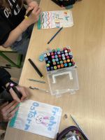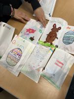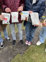 Am Donnerstag vor den Osterferien trafen sich die 7B und die 1D mit ihren Klassenvorständinnen für ein gemeinsames Partnerklassenprojekt. Zuerst bemalten die beiden Klassen getrennt voneinander Papiersäckchen und befüllten sie mit Eiern und Süßigkeiten, um sie dann in unterschiedlichen Teilen des Schulhofs zu verstecken.